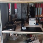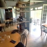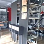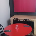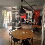 sept tables plateau carré bambou piètement métal – deux tables plateau rond hêtre huilé piètement chromé – deux tables plateau rond médium piètement métal – une table rectangle stratifié beige – dix fauteuils tout métal – vingt chaises tout métal – quatre suspensions électriques métal noir et gris – huit suspensions électrique verre rouge – trois réglettes électriques de six spots chromés